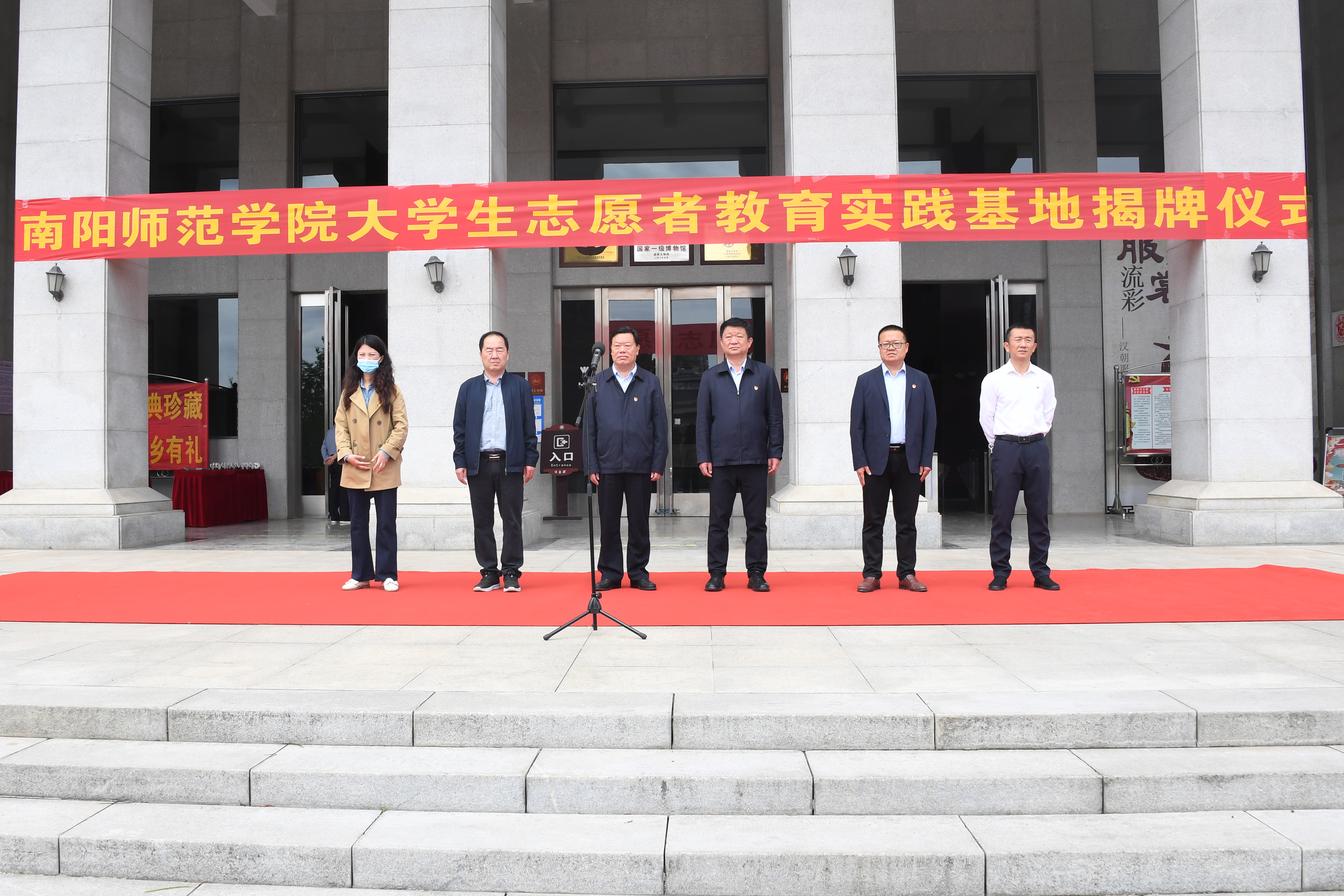 本网讯(郑盈盈 杨眉/文 杨毅鑫/图)在五四青年节到来之际,为积极践行志愿服务精神,5月4日上午,永利官网与南阳市汉画馆共建“大学生志愿者教育实践基地”揭牌仪式在汉画馆广场举行。校党委副书记谢冰松,南阳市文广旅局党组书记、局长任永亮,南阳市汉画馆馆长刘新出席仪式。校团委、地理科学与旅游学院相关负责同志,南阳市汉画馆全体工作人员和地理科学与旅游学院师生志愿者代表参加。