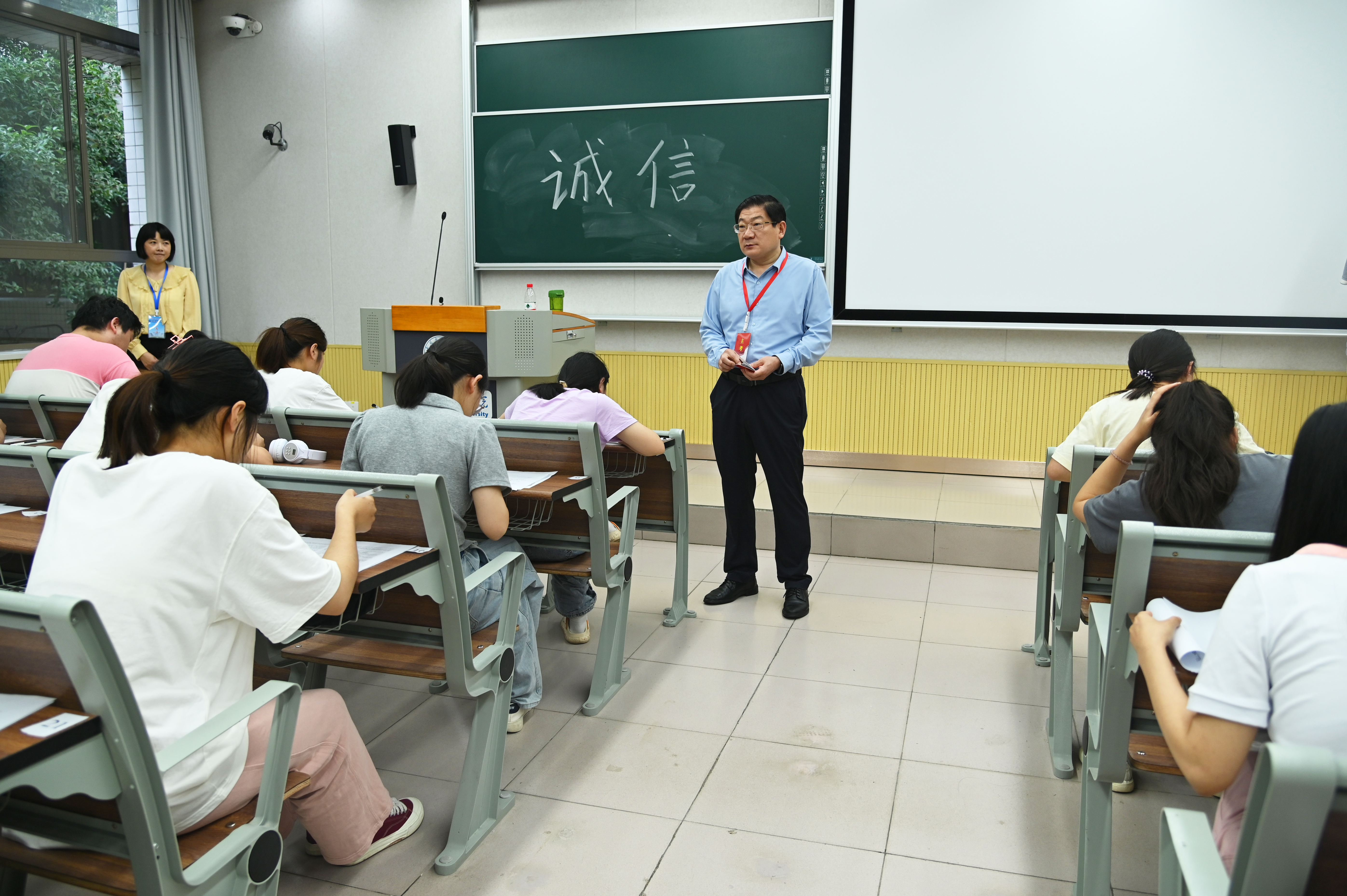本网讯(裴玺/文 杨毅鑫/图)6月19日,校党委书记卢志文到中、西教学区期末考试考场巡视调研。教务处、学生处等部门负责同志一同前往。