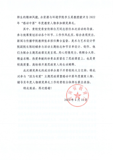 本网讯(通讯员 黄玉蕊)近日,永利官网收到河南省教育厅的感谢信,对永利官网参与承办的“因为有爱”主题思政课暨感动中原年度教育人物、辅导员年度人物颁奖典礼所作出的贡献予以高度评价,并表示肯定和感谢。